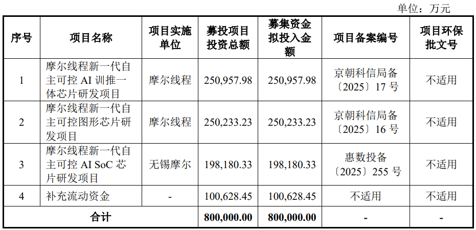 摩尔线程本次发行募集资金总额799,960.00万元,扣除发行费用后的募集资金净额为757,605.23万元,比原计划少42,394.77万元。摩尔线程2025年11月28日披露的招股书显示,公司拟募集资金800,000.00万元,用于摩尔线程新一代自主可控AI训推一体芯片研发项目、摩尔线程新一代自主可控图形芯片研发项目、摩尔线程新一代自主可控AISoC芯片研发项目、补充流动资金。