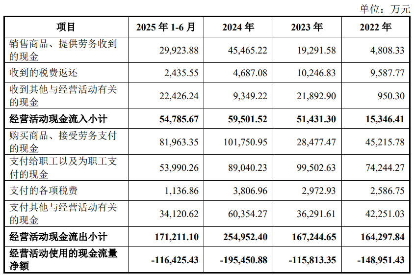 上述同期,公司销售商品、提供劳务收到的现金分别为4,808.33万元、19,291.58万元、45,465.22万元,经营活动使用的现金流量净额分别为-148,951.43万元、-115,813.35万元、-195,450.88万元。