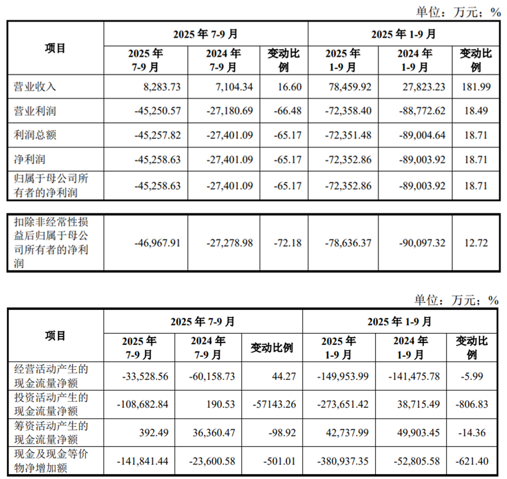 2025年1-9月,摩尔线程的营业收入为78,459.92万元,净利润/归属于母公司所有者的净利润为-72,352.86万元,扣除非经常性损益后归属于母公司所有者的净利润为-78,636.37万元,经营活动产生的现金流量净额为-149,953.99万元。