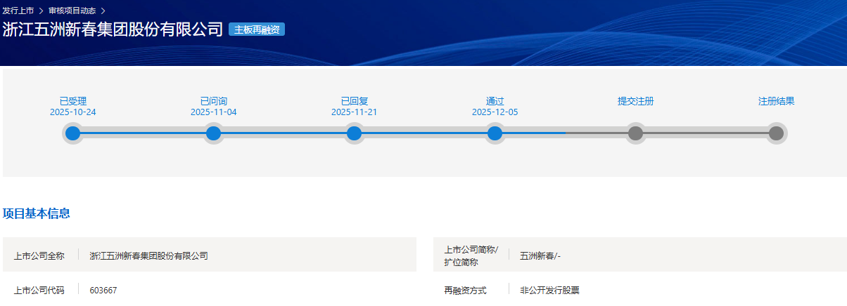 中国经济网北京12月7日讯 上交所网站5日更新的审核项目动态显示,五洲新春(603667.SH)非公开发行股票的审核状态为通过。