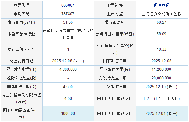 优迅股份2025年12月5日披露的首次公开发行股票并在科创板上市发行公告显示,按本次发行价格51.66元/股和2,000.00万股的新股发行数量计算,若本次发行成功,预计公司募集资金总额103,320.00万元,扣除发行费用(不含增值税)10,551.17万元,预计募集资金净额为92,768.83万元(如有尾数差异,为四舍五入所致)。