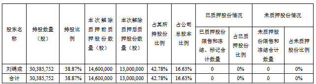2025年11月18日公告显示,刘锦成13,000,000股处于质押状态,占公司总股本比例为16.63%。