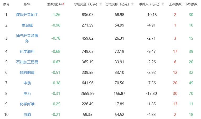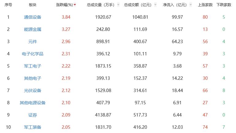板块方面,通信设备、能源金属、元件等涨幅居前,煤炭开采加工、贵金属、油气开采及服务等跌幅居前。
