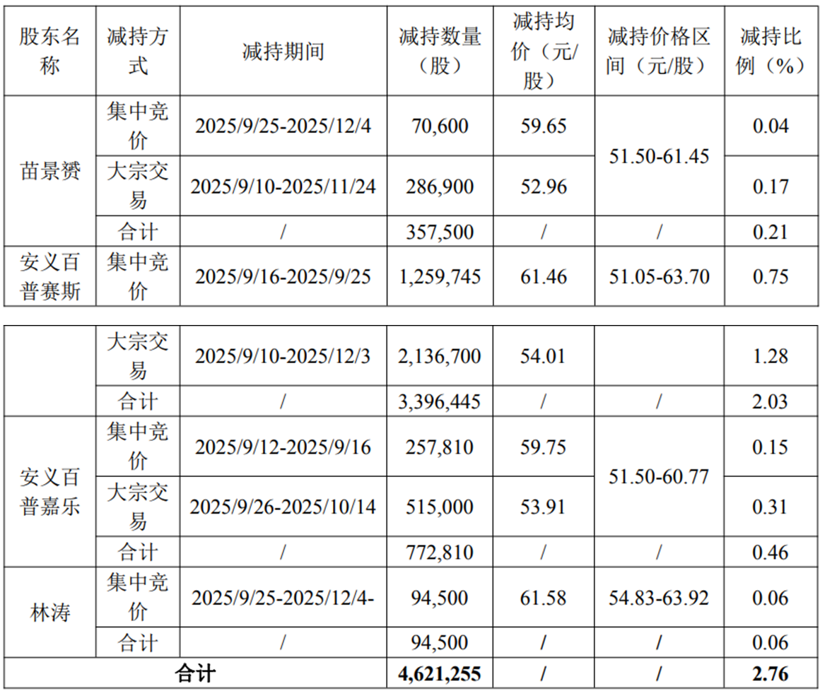 苗景赟减持357,500股,减持金额约1940.55万元;安义百普赛斯减持3,396,445股,减持金额约1.93亿元;安义百普嘉乐减持772,810股,减持金额约4316.78万元。上述三名股东合计减持金额约2.56亿元。林涛减持94,500股,减持金额约581.93万元。