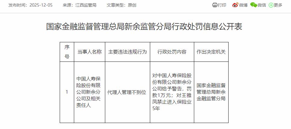 国家金融监督管理总局新余金融监管分局对中国人寿保险股份有限公司新余分公司给予警告,罚款1万元;对王雅凤禁止进入保险业5年。