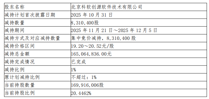 2025年11月21日至2025年12月5日,科软创源合计减持公司股份8,310,400股,占公司股份总数的1%,均通过集中竞价交易方式减持,减持价格区间为19.20至20.52元/股,减持总金额为165,064,836.00元。