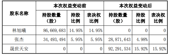 根据上述交易安排,若本次股份转让及表决权放弃最终实施完成,晟世天安将持有上市公司股份92,291,534股,占上市公司总股本的15.92%。公司控股股东、实际控制人将发生变更,晟世天安将成为公司控股股东,公司实际控制人将从林旭曦和张杰变更为李宁和王磊。