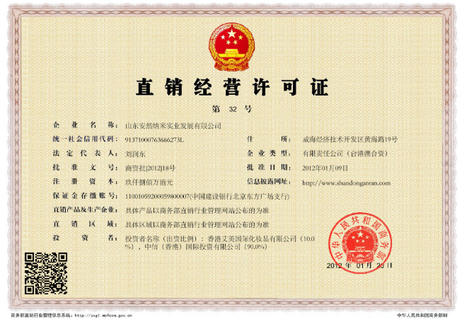商务部网站显示,山东安然纳米实业发展有限公司2012年1月9日获批直销经营许可证,共有9个分支机构,72个服务网点,直销产品3类27种。