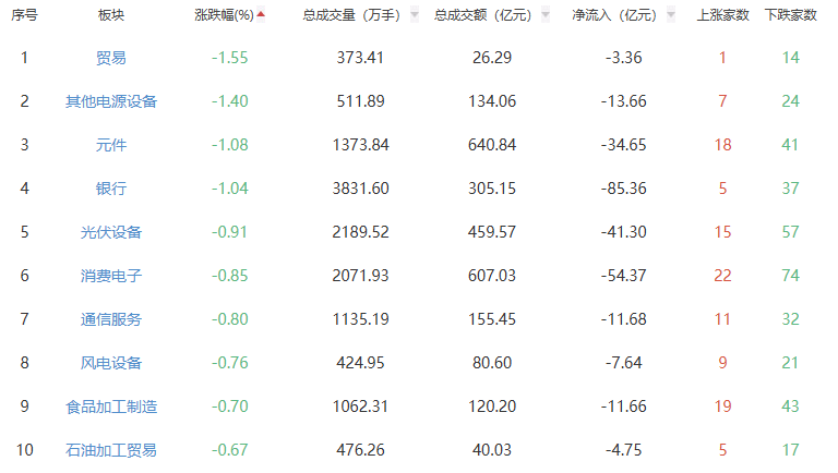 板块方面,贵金属、零售、教育等板块涨幅居前,贸易、其他电源设备、元件等板块跌幅居前。