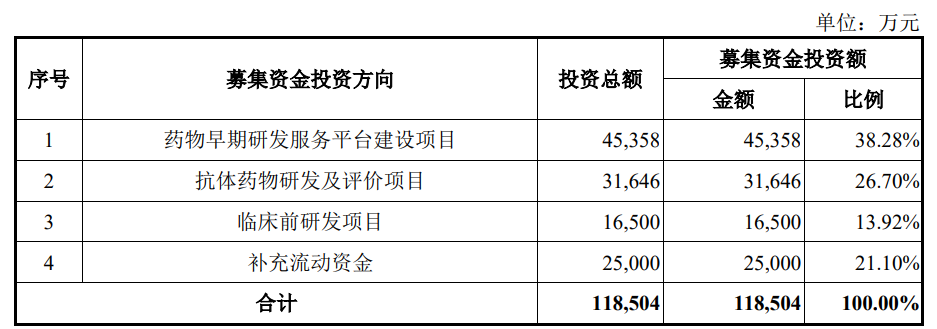 百奥赛图本次发行募集资金总额为126,730.00万元,扣除发行费用后募集资金净额为114,405.93万元,比原计划少4,098.07万元。百奥赛图2025年12月4日披露的招股书显示,公司拟募集资金118,504万元,用于药物早期研发服务平台建设项目、抗体药物研发及评价项目、临床前研发项目、补充流动资金。