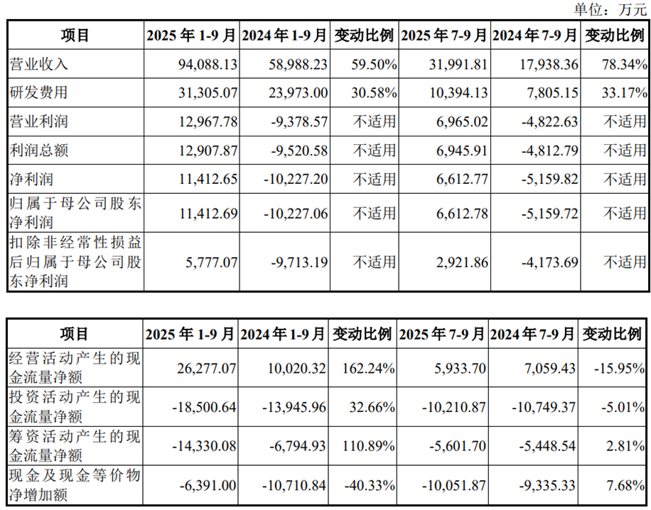2025年1-9月,公司实现营业收入94,088.13万元,同比增长59.50%;实现净利润/归属于母公司股东净利润11,412.69万元;实现扣除非经常性损益后归属于母公司股东净利润5,777.07万元;经营活动产生的现金流量净额为26,277.07万元。