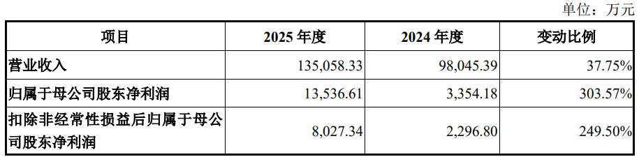 2025年度,公司预计营业收入约为135,058.33万元,同比增幅约为37.75%;预计归属于母公司股东净利润约为13,536.61万元,较去年同期变动幅度约为303.57%;预计扣除非经常性损益后归属于母公司所有者的净利润约为8,027.34万元,较去年同期变动幅度约为249.50%。