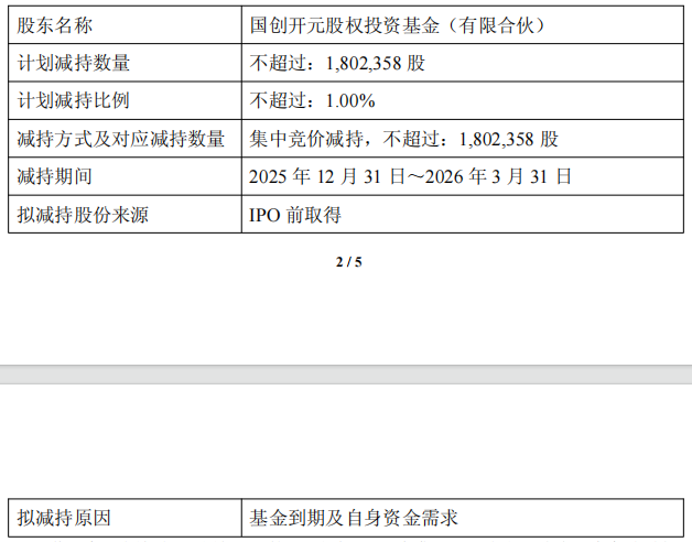因基金到期及自身资金需求,国创开元拟通过集中竞价方式减持公司股份不超过1,802,358股,即不超过公司总股本的1.00%,自本公告披露之日起15个交易日后的3个月内进行,且任意连续90日内减持股份总数不超过公司总股本的1.00%。