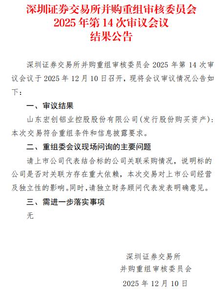 中国经济网北京12月11日讯 深交易并购重组审核委员会2025年第14次审议会议于昨日召开,会议审议结果显示,山东宏创铝业控股股份有限公司(宏创控股,002379.SZ)发行股份购买资产符合重组条件和信息披露要求。