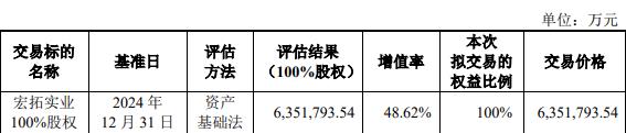 根据中联评估出具的《评估报告》(中联评报字[2025]第900号),以资产基础法作为最终评估结论。资产基础法下,标的公司母公司口径账面净资产3,078,576.08万元,合并口径归属于母公司的所有者权益账面值4,273,980.76万元,股东全部权益评估值6,351,793.54万元,相比合并口径归属于母公司的所有者权益账面值评估增值2,077,812.78万元,增值率 48.62%。标的宏拓实业100%股权最终确定本次交易作价金额为6,351,793.54万元。