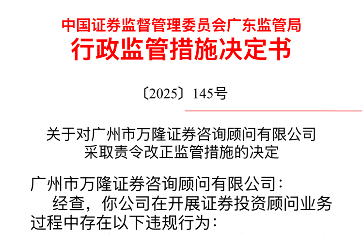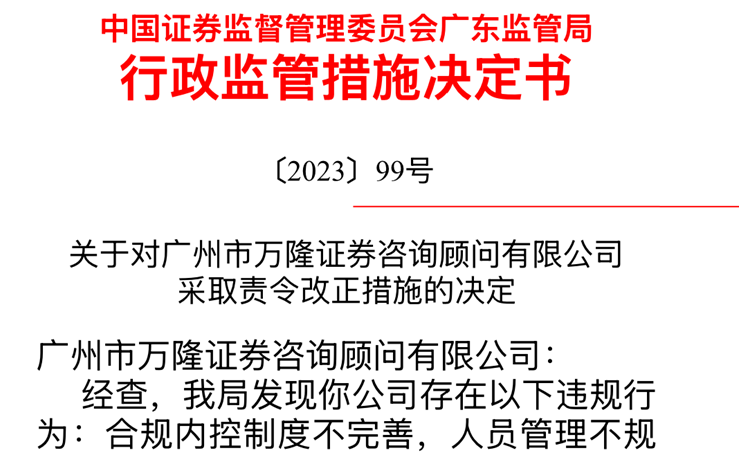 近日,中国证券监督管理委员会广东监管局(以下简称“中国证监会广东监管局”)官网发布行政监管措施决定书,广州市万隆证券咨询顾问有限公司(以下简称“万隆证券”)被采取责令改正监管措施。