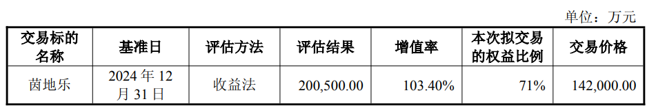 本次交易完成后茵地乐成为公司的控股子公司,其资产及经营业绩将计入公司合并财务报表。根据中联评估出具的《资产评估报告》(中联评报字〔2025〕第518号),以2024年12月31日为评估基准日,经交易各方协商确定标的资产的交易对价为142,000万元,增值率103.40%。