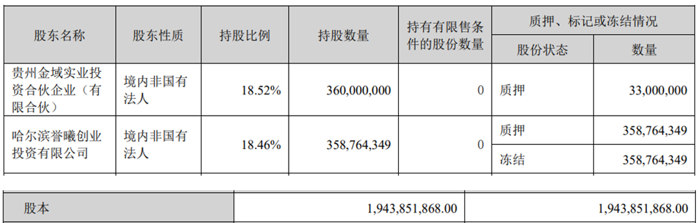信邦制药2025年三季报显示,公司控股股东贵州金域实业投资合伙企业(有限合伙)(简称“金域实业”)质押33,000,000股,第二大股东哈尔滨誉曦创业投资有限公司质押358,764,349股,二者质押股份合计占公司总股本的20.15%。
