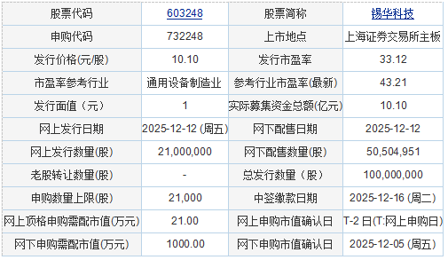 锡华科技2025年12月11日披露的首次公开发行股票并在主板上市发行公告显示,公司本次募投项目预计使用募集资金金额为149,784.26万元。按本次发行价格10.10元/股和10,000.0000万股的新股发行数量计算,若本次发行成功,预计公司募集资金总额101,000.00万元,扣除约8,423.43万元(不含增值税)的发行费用后,预计募集资金净额92,576.57万元(如有尾数差异,为四舍五入所致)。