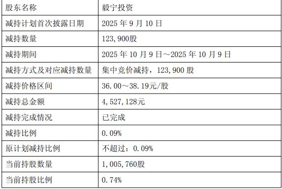 公司于2025年9月10日披露《实际控制人的一致行动人减持股份计划公告》,凯弘投资、毅宁投资系员工持股平台,本次减持主要为解决该平台中员工个人资金需求,拟从2025年10月9日至2026年1月8日期间,通过集中竞价交易和/或大宗交易方式减持所持公司股份,凯弘投资减持数量不超过801,625股(占公司总股本比例0.59%);毅宁投资减持数量不超过123,900股(占公司总股本比例0.09%)。截至公告披露日,凯弘投资、毅宁投资已通过集中竞价交易方式减持公司股份分别为801,600股、123,900股,分别占公司总股本的0.59%、0.09%,上述股东本次减持计划已实施完毕。上述减持金额共计34056887元。