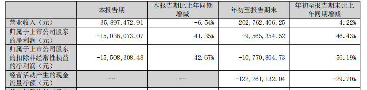中国经济网北京12月12日讯 佳缘科技(301117.SZ)2025年三季度报告显示,2025年前三季,公司实现营业收入2.03亿元,同比增长4.22%;归属于上市公司股东的净利润-956.54万元,同比增长46.43%;归属于上市公司股东的扣除非经常性损益的净利润-1077.08万元,同比增长56.19%;经营活动产生的现金流量净额-1.22亿元,同比下降29.70%。