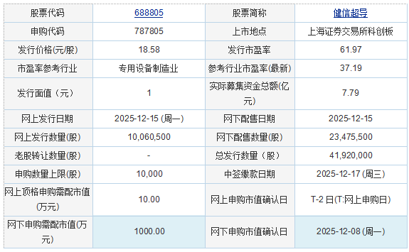 健信超导2025年12月12日披露的首次公开发行股票并在科创板上市发行公告显示,按本次发行价格18.58元/股和4,192.00万股的新股发行数量计算,若本次发行成功,预计公司募集资金总额77,887.36万元,扣除约9,023.09万元(不含增值税)的发行费用后,预计募集资金净额68,864.27万元。