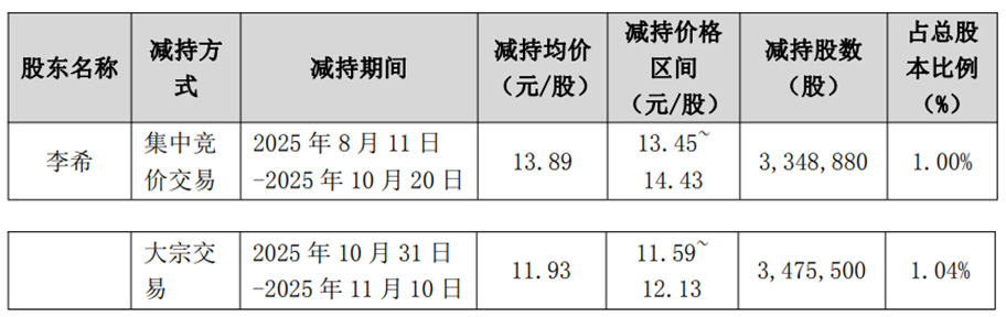 根据润都股份11月12日披露的《关于持股5%以上股东减持计划期限届满暨实施结果的公告》显示,李希于2025年8月11日至2025年11月10日通过集中竞价方式减持其持有的公司无限售条件流通股3,348,880股,通过大宗交易方式减持其持有的公司无限售条件流通股3,475,500股,合计6,824,380股,本次减持计划期限已届满。