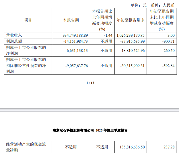 中国经济网北京12月16日讯 冠石科技(605588.SH)近日发布2025年第三季度报告显示,2025年第三季度,公司实现营业收入3.35亿元,同比下滑1.44%;归属于上市公司股东的净利润-663.11万元;归属于上市公司股东的扣除非经常性损益的净利润-905.76万元。