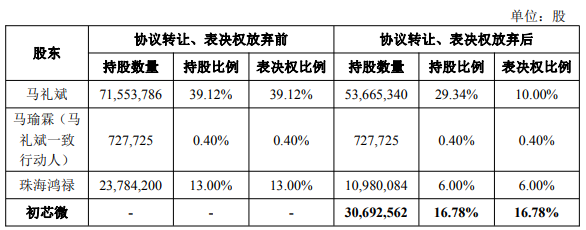 同日,初芯微与马礼斌签署《表决权放弃协议》,自马礼斌将其持有的17,888,446股上市公司股份(占本协议签署日上市公司股份总数的9.78%)按照《股份转让协议》约定的条款和条件通过协议转让方式转让给初芯微,并完成股份过户登记且马礼斌收到全部转让价款之日起,马礼斌无条件、不可撤销地放弃其持有的上市公司35,373,745股股份(占协议签署日上市公司股份总数的19.34%)的表决权,表决权放弃期限至初芯微及其一致行动人已成为上市公司第一大股东,且持有及控制的表决权比例超过届时上市公司第二大股东及其一致行动人(如有)相应比例5%(含本数)或者初芯微及其一致行动人直接或间接减持其所持上市公司股份时终止。