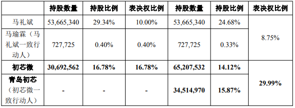 本次发行完成后,在不考虑其他因素可能导致股本数量变动的情况下,按照拟发行股数计算,青岛初芯持股比例由0%增加至15.87%,初芯微和青岛初芯合计持股比例增加至29.99%。