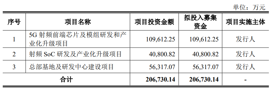 昂瑞微本次发行募集资金总额206,677.55万元,扣除发行费用后募集资金净额为193,232.27万元,比原计划少13,497.87万元。昂瑞微2025年12月11日披露的招股书显示,公司拟募集资金206,730.14万元,用于5G射频前端芯片及模组研发和产业化升级项目、射频SoC研发及产业化升级项目、总部基地及研发中心建设项目。