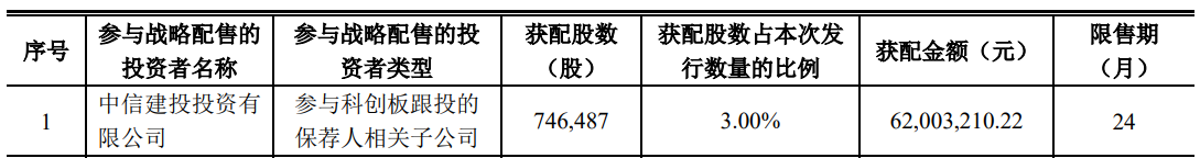 中信建投证券股份有限公司的子公司中信建投投资有限公司参与昂瑞微的战略配售,获配股数746,487股,占本次发行数量的3.00%,获配金额为62,003,210.22元。