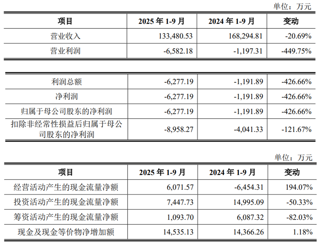 2025年1-9月,公司营业收入为133,480.53万元,同比变动-20.69%;净利润/归属于母公司股东的净利润-6,277.19万元,同比变动-426.66%;扣除非经常性损益后归属于母公司股东的净利润-8,958.27万元,同比变动-121.67%;经营活动产生的现金流量净额为6,071.57万元,同比变动194.07%。