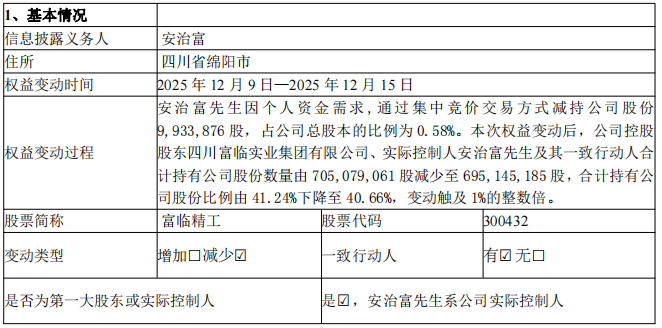 中国经济网北京12月16日讯 富临精工(300432.SZ)昨晚披露关于控股股东、实际控制人及其一致行动人权益变动触及1%整数倍的公告称,公司于2025年11月17日披露了《关于实际控制人减持股份的预披露公告》,公司实际控制人安治富计划自上述公告披露之日起十五个交易日后的三个月内,以集中竞价交易方式减持公司股份累计不超过17,097,602股(占本公司总股本比例1.00%)。