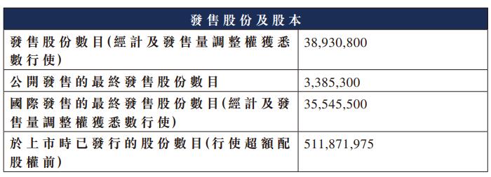 最终发售价及分配结果公告显示,发售股份数目38,930,800股,其中,公开发售的最终发售股份数目3,385,300股,国际发售的最终发售股份数目35,545,500股。