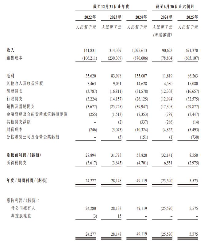 2022年、2023年、2024年、2025年前6月,果下科技的收入分别为1.42亿元、3.14亿元、10.26亿元、6.91亿元;期间利润分别为2427.7万元、2814.8万元、4911.9万元、557.5万元。
