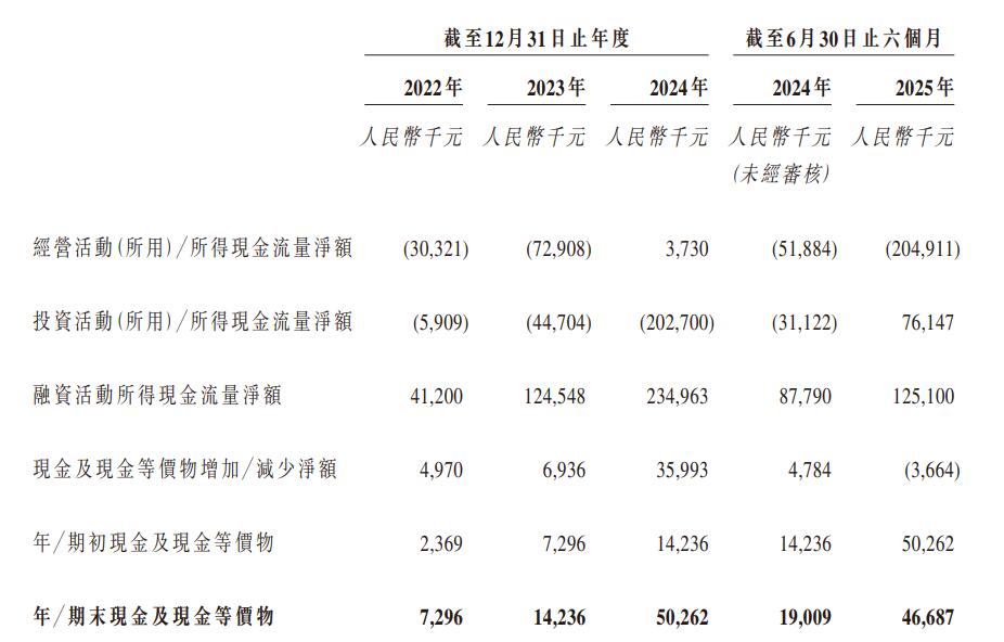 2022年、2023年、2025年前6月,果下科技经营活动所用现金流量净额分别为3032.1万元、7290.8万元、2.05亿元。其中,2024年,公司经营活动所得现金流量净额为373万元。