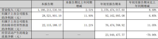 年初至报告期末,公司实现营业收入33.76亿元,同比增长8.68%;归属于上市公司股东的净利润9216.30万元,同比增长6.85%;扣除非经常性损益后的净利润7647.48万元,同比增长11.05%;经营活动产生的现金流量净额2394.95万元,同比减少79.96%。