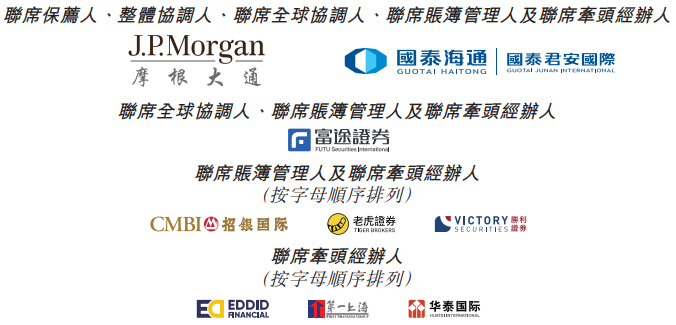 HASHKEY HLDGS的联席保荐人、整体协调人、联席全球协调人、联席账簿管理人及联席牵头经办人为J.P. Morgan Securities (Far East) Limited、国泰君安融资有限公司,联席全球协调人、联席账簿管理人及联席牵头经办人为富途证券国际(香港)有限公司,联席账簿管理人及联席牵头经办人为招银国际融资有限公司、老虎证券(香港)环球有限公司、胜利证券有限公司,联席牵头经办人为艾德证券期货有限公司、第一上海证券有限公司、华泰金融控股(香港)有限公司。