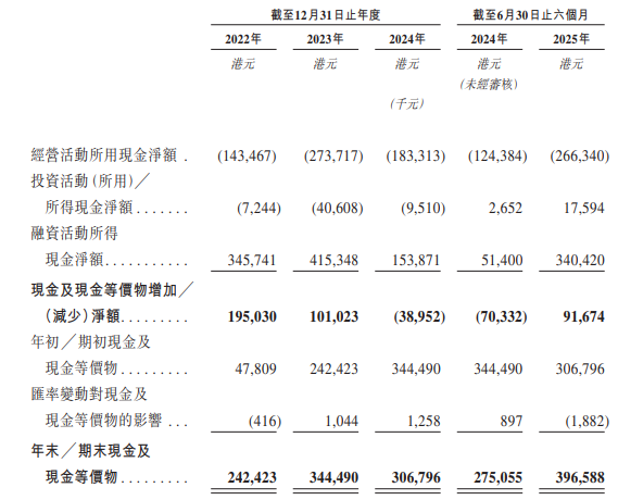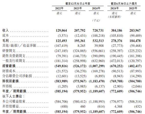 于2022年、2023年、2024年、2025年上半年,公司的收入分别为129.1百万港元、207.8百万港元、720.7百万港元、284.0百万港元;分别录得期内亏损585.2百万港元、580.0百万港元、1,189.6百万港元、506.7百万港元。