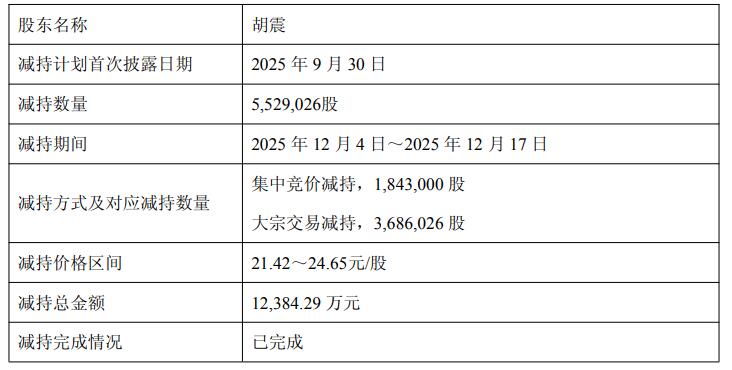 公告显示,2025年12月4日至2025年12月17日,胡震减持价格区间21.42元/股至24.65元/股,减持总金额12,384.29万元。