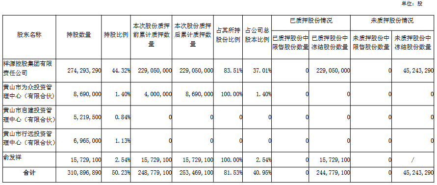 交建股份12月16日晚间披露《关于控股股东一致行动人部分股份质押的公告》。公告显示,控股股东祥源控股集团有限责任公司累计质押数量229,050,000股,占其所持股份比例83.51%,占公司总股本比例37.01%。控股股东之一致行动人黄山市为众投资管理中心(有限合伙)累计质押数量8,690,000股,占其所持股份比例100.00%,占公司总股本比例1.40%。实际控制人俞发祥累计质押数量15,729,100股,占其所持股份比例100.00%,占公司总股本比例2.54%。上述股东累计质押数量253,469,100股,占其所持股份比例81.53%,占公司总股本比例40.95%。