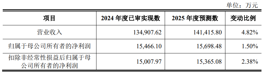 元创股份预测2025年度实现营业收入141,415.80万元,较上年增长4.82%;预测2025年度归属于母公司所有者的净利润为15,698.48万元,较上年增长1.50%;预测2025年度扣除非经常性损益后归属于母公司所有者的净利润为15,365.08万元,较上年增长2.38%。