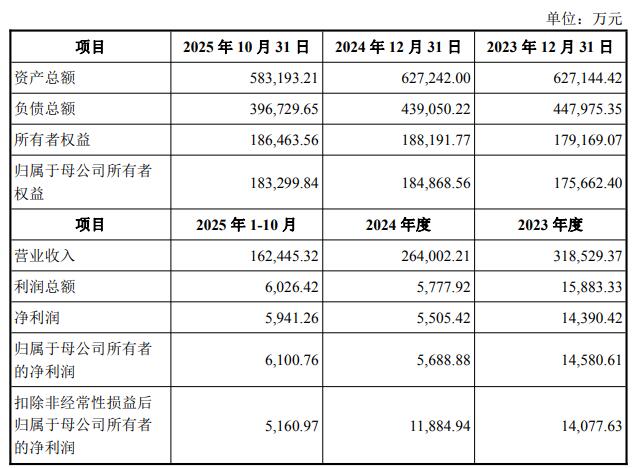 2023年、2024年、2025年1-10月,中控信息实现营业收入分别为318,529.37万元、264,002.21万元、162,445.32万元;净利润分别为14,390.42万元、5,505.42万元、5,941.26万元;归属于母公司所有者的净利润分别为14,580.61万元、5,688.88万元、6,100.76万元;扣除非经常性损益后归属于母公司所有者的净利润分别为14,077.63万元、11,884.94万元、5,160.97万元。