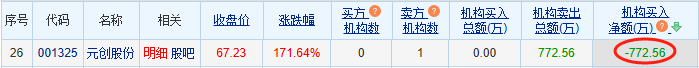 龙虎榜数据显示,卖出元创股份金额最大的前五名中,有1家机构专用席位。经统计,机构席位今日卖出元创股份净额为772.56万元。
