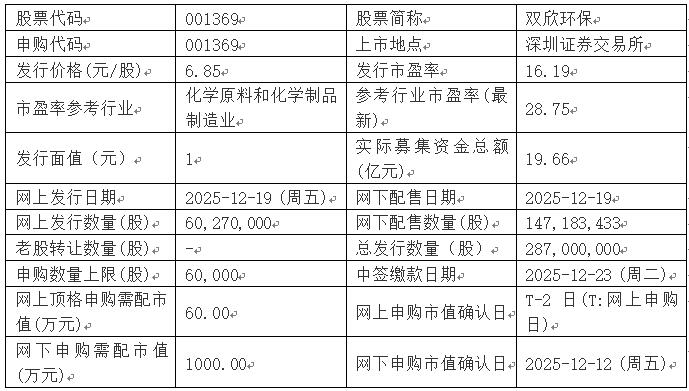 双欣环保2025年12月18日发布的首次公开发行股票并在主板上市发行公告显示,按本次发行价格6.85元/股和28,700.0000万股的新股发行数量计算,若本次发行成功,预计发行人募集资金总额为196,595.00万元,扣除发行费用16,829.37万元(不含增值税)后,预计募集资金净额为179,765.63万元。