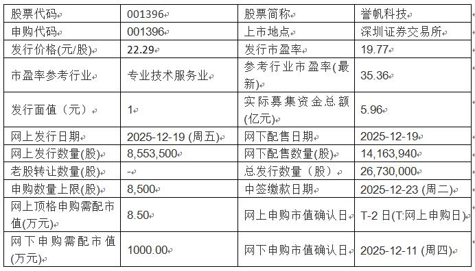 誉帆科技2025年12月18日发布的首次公开发行股票并在主板上市发行公告显示,本次公开发行新股2,673.0000万股,本次发行不设老股转让。按本次发行价格22.29元/股计算,预计募集资金59,581.17万元,扣除发行费用8,043.49万元(不含增值税)后,预计募集资金净额为51,537.68万元。