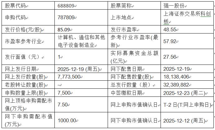 强一股份2025年12月18日发布的首次公开发行股票并在科创板上市发行公告显示,按本次发行价格85.09元/股和3,238.9882万股的新股发行数量计算,若本次发行成功,预计发行人募集资金总额275,605.51万元,扣除约22,959.33万元(不含增值税)的发行费用后,预计募集资金净额252,646.18万元。