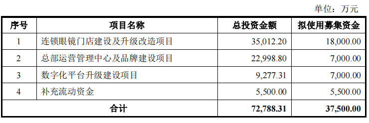 本次发行可转换公司债券的募集资金总额不超过人民币37,500.00万元(含37,500.00万元),扣除发行费用后的募集资金净额拟用于投入以下项目:连锁眼镜门店建设及升级改造项目、总部运营管理中心及品牌建设项目、数字化平台升级建设项目、补充流动资金。