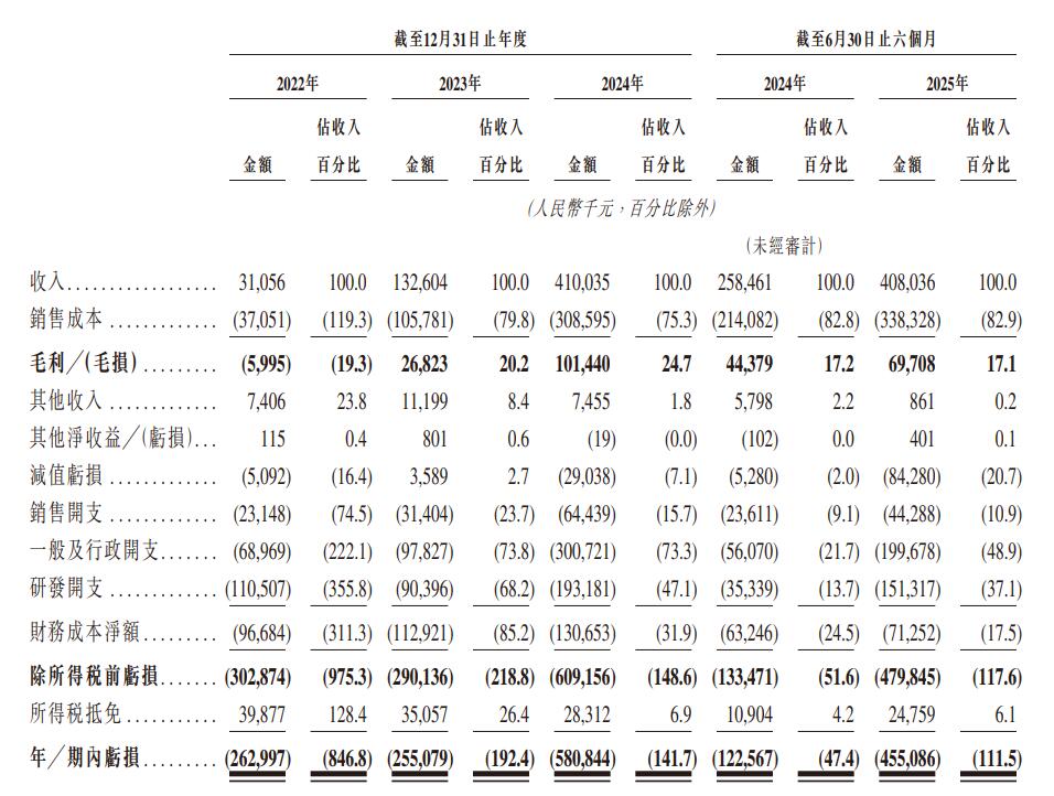 2022年、2023年、2024年、2025年上半年,希迪智驾的收入分别为3105.6万元、1.33亿元、4.10亿元、4.08亿元;期内亏损分别为2.63亿元、2.55亿元、5.81亿元、4.55亿元。
